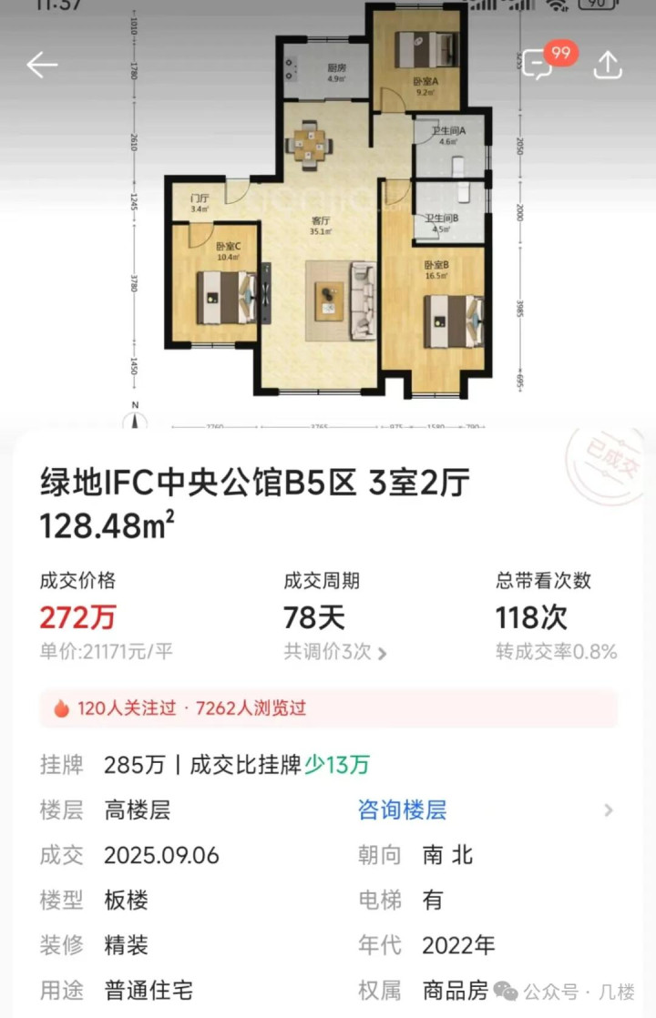 CBD小高层一梯一户,好楼层,总价272万,单价21000+,去年这个户型卖350万。