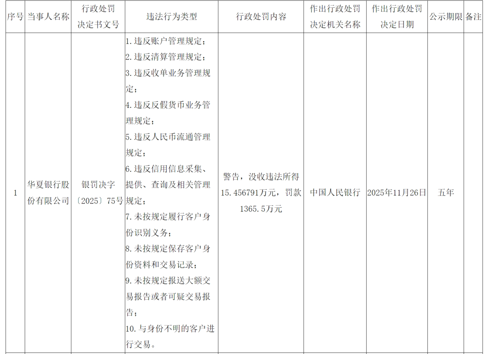 同日,华夏银行股份有限公司,因10项违法行为,被警告,没收违法所得15.456791万元,罚款1365.5万元。