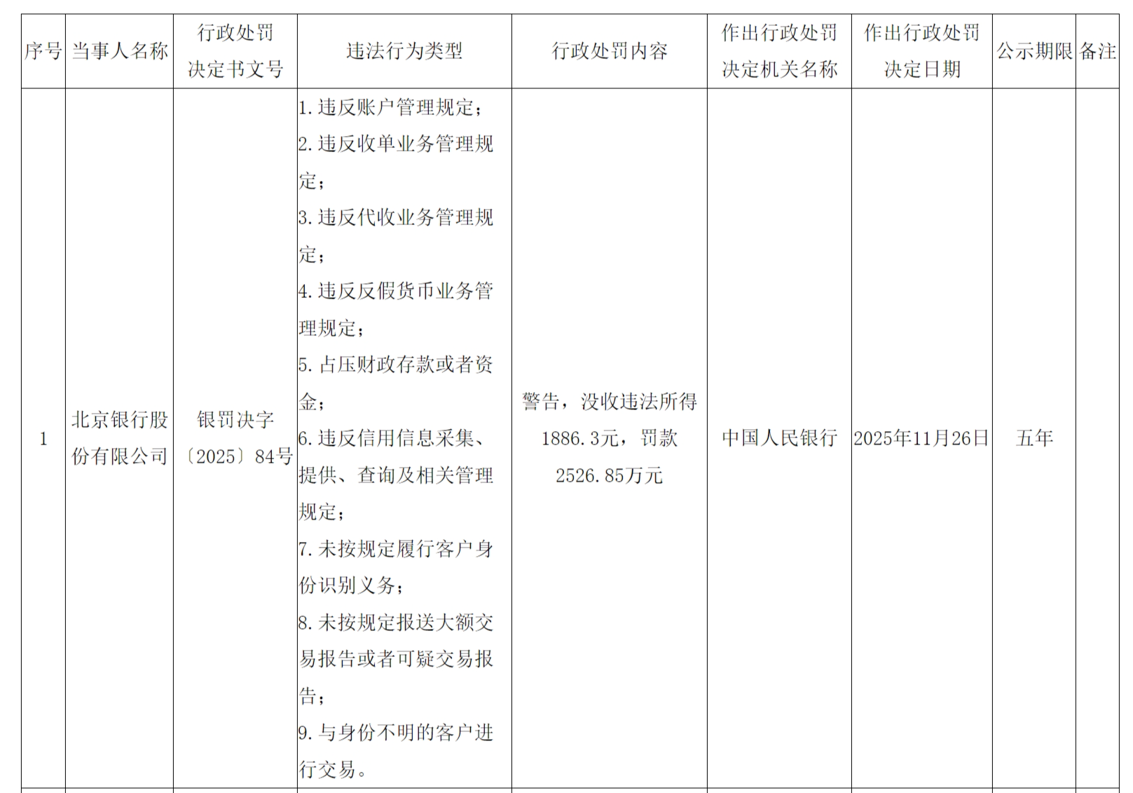 11月28日,中国人民银行行政处罚公示显示,北京银行股份有限公司,因9类违法行为,被警告并没收违法所得1886.3元,罚款2526.85万元。