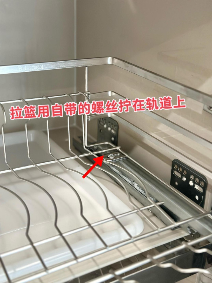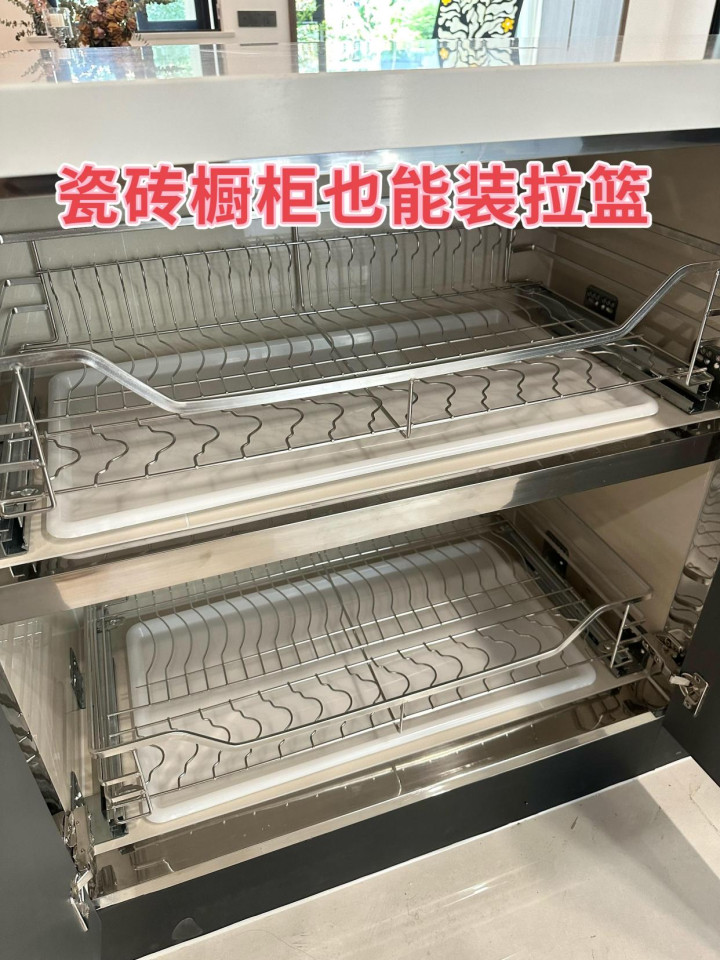 像网友@苹果的家,做的瓷砖橱柜还能安装拉篮,购买尺寸合适的拉篮和轨道后,瓷砖打孔或者用免钉胶固定轨道,拉篮用自带的螺丝拧在轨道上,再放上接水盘就完事了。