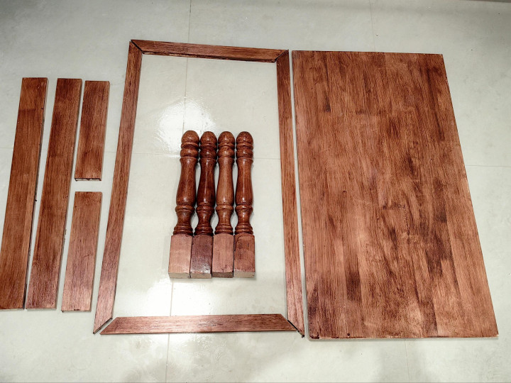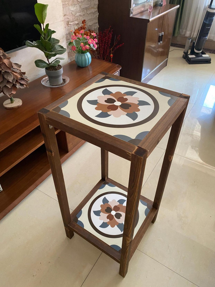 就是用板子和四个边拼成一个桌面,把瓷砖嵌入在里面,再加上4条桌腿,就是一个实用的茶几了。